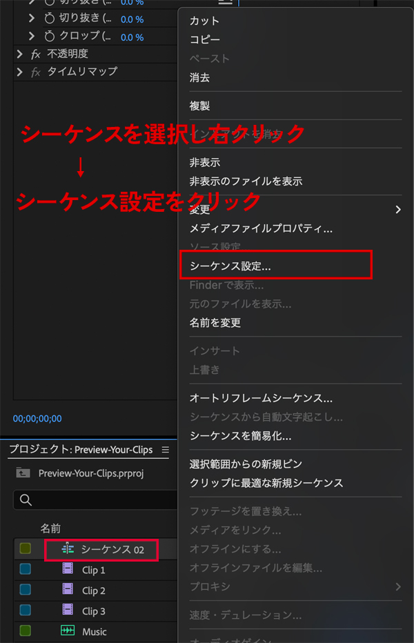 シーケンスを右クリック>シーケンス設定で設定画面を表示。