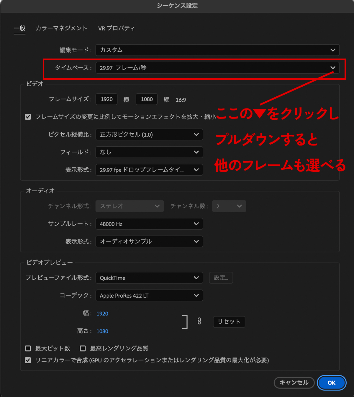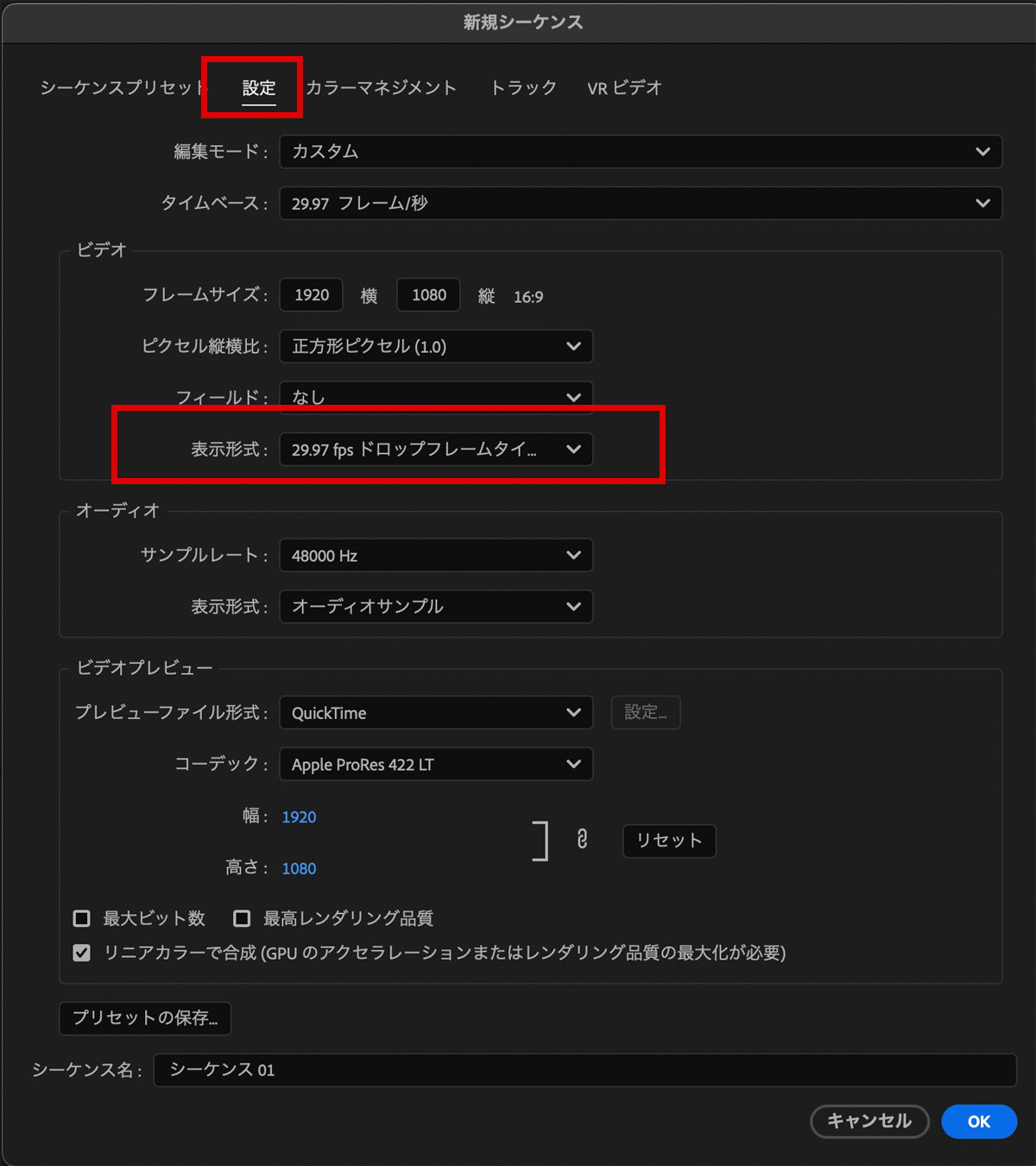 または新規シーケンスを作るときに出てくるプリセットや設定画面からでも設定できる。