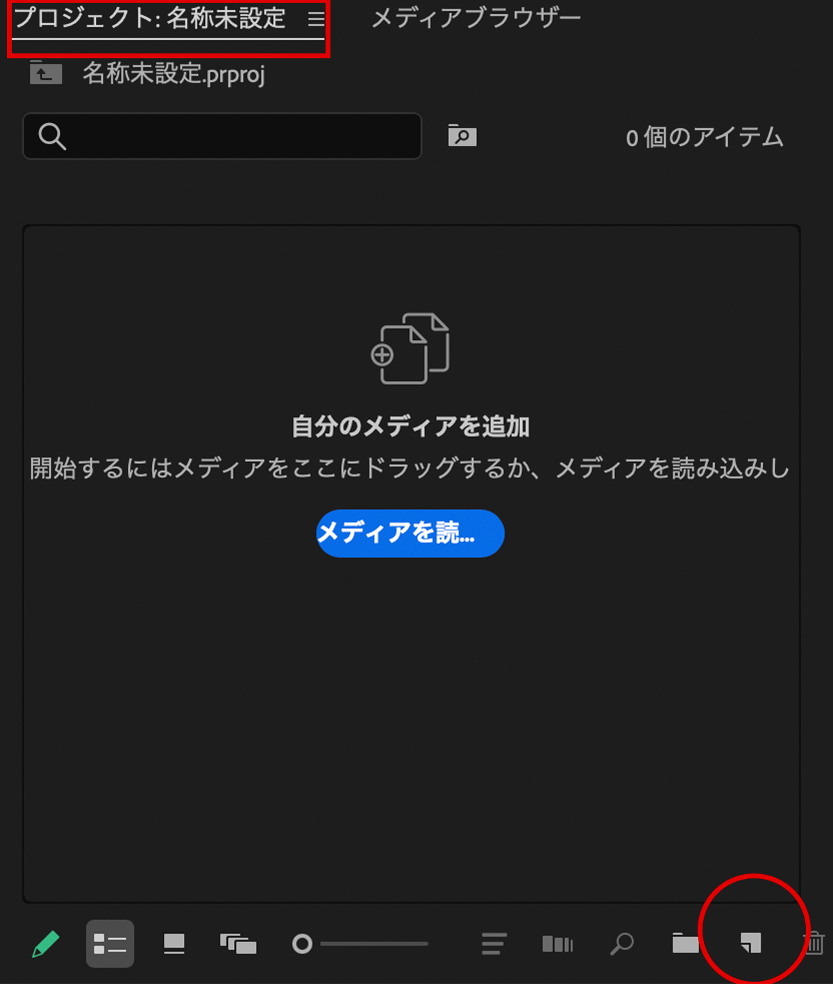 新規シーケンスは、プロジェクトパネルの下のフォルダとゴミ箱の間のアイコンをクリックするして作る。