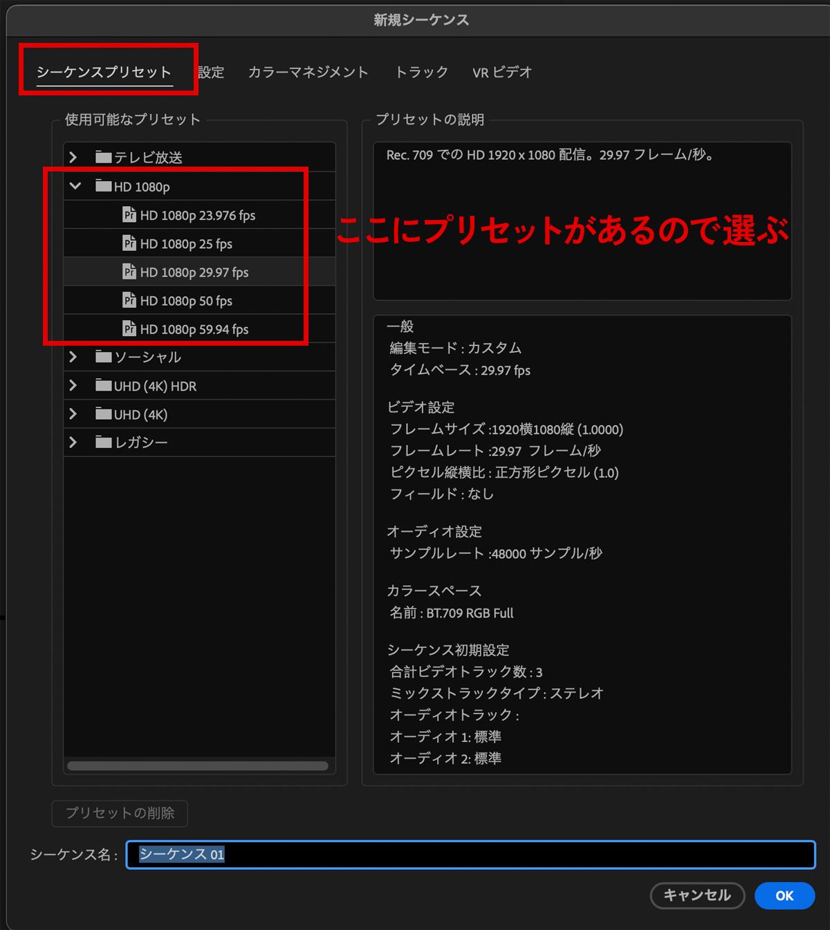 または新規シーケンスを作るときにも、設定またはプリセットからフレームを選べる