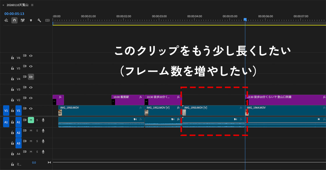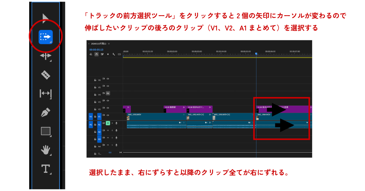 編集中に画像を差し込みたいときにインサートペーストが便利だけど、編集中にクリップの長さを広げたい(フレーム数を増やしたい)ときに便利なのが、この「トラックの前方選択ツール」。