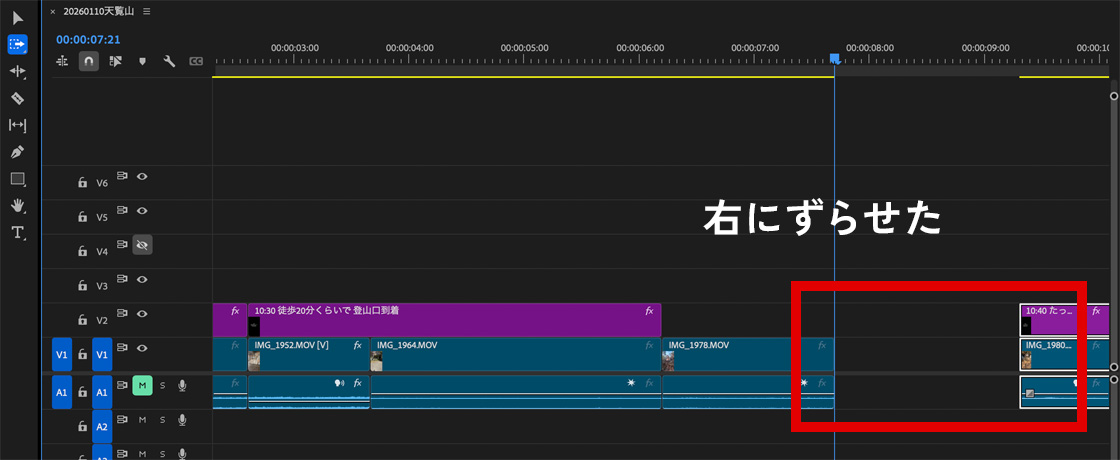 右にずらしたいクリップを選択して右にずらすだけです。