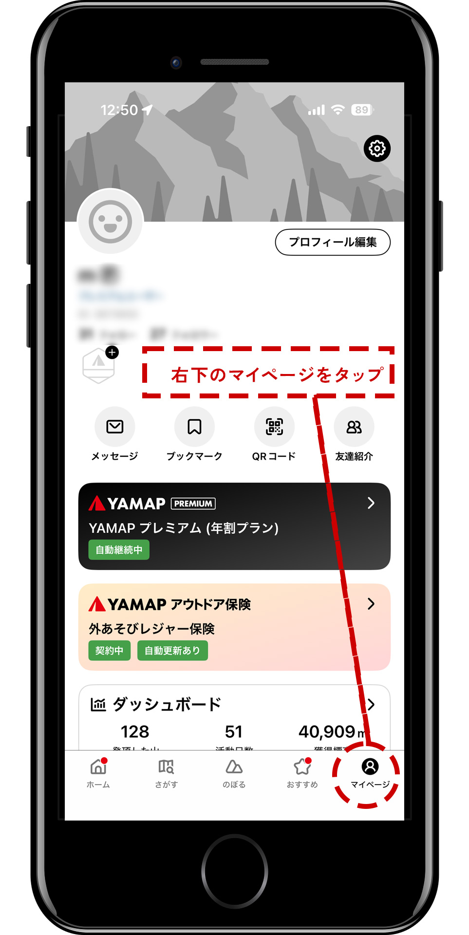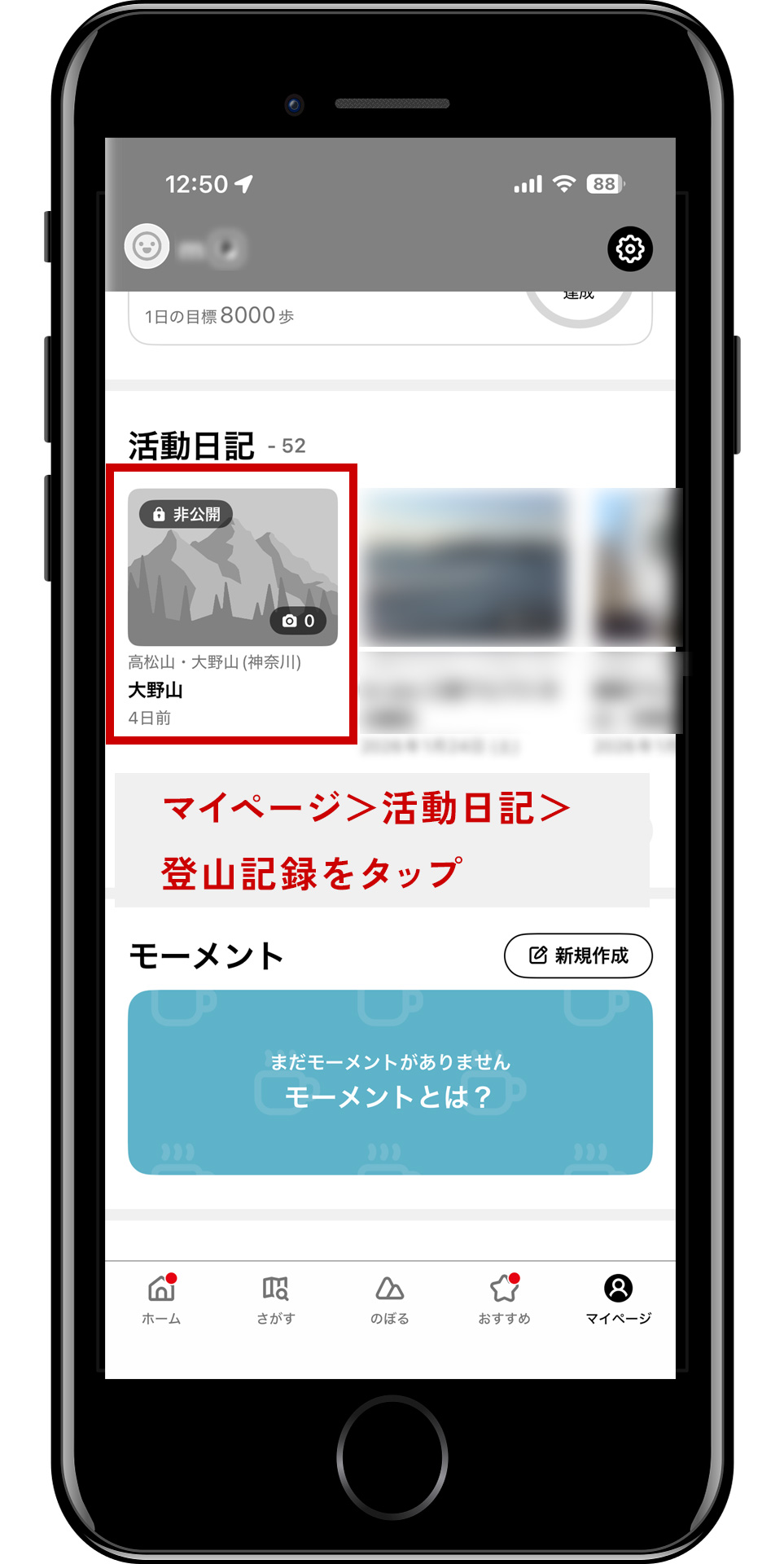 早速、YAMAPのマイページで自分の活動日記を開きます。