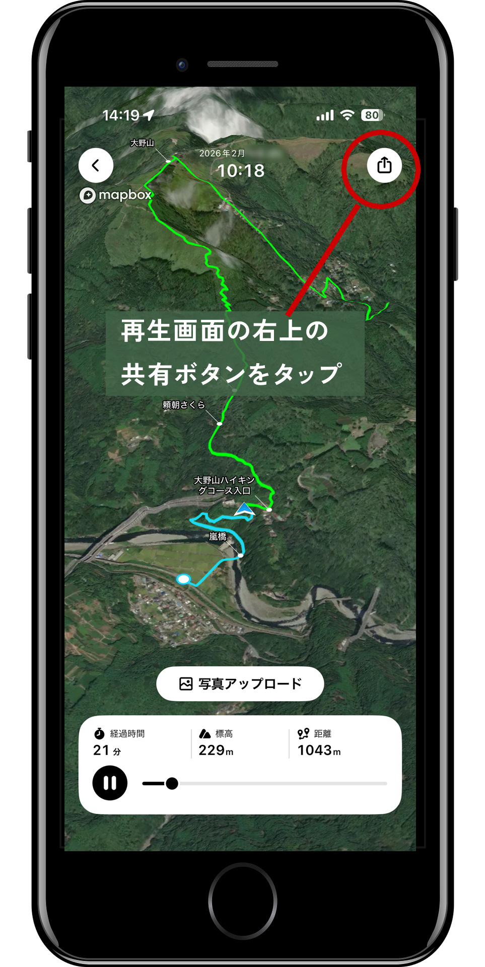 次に、大野山の活動日記を開くとでてくる、3Dリプレイをタップ。