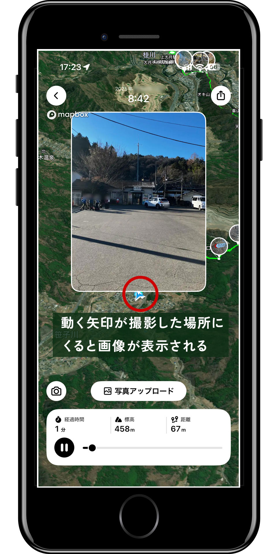 (公開・非公開に関わらず)活動日記に画像を投稿すると、この3Dリプレイに画像を含めた軌跡が表示されます。