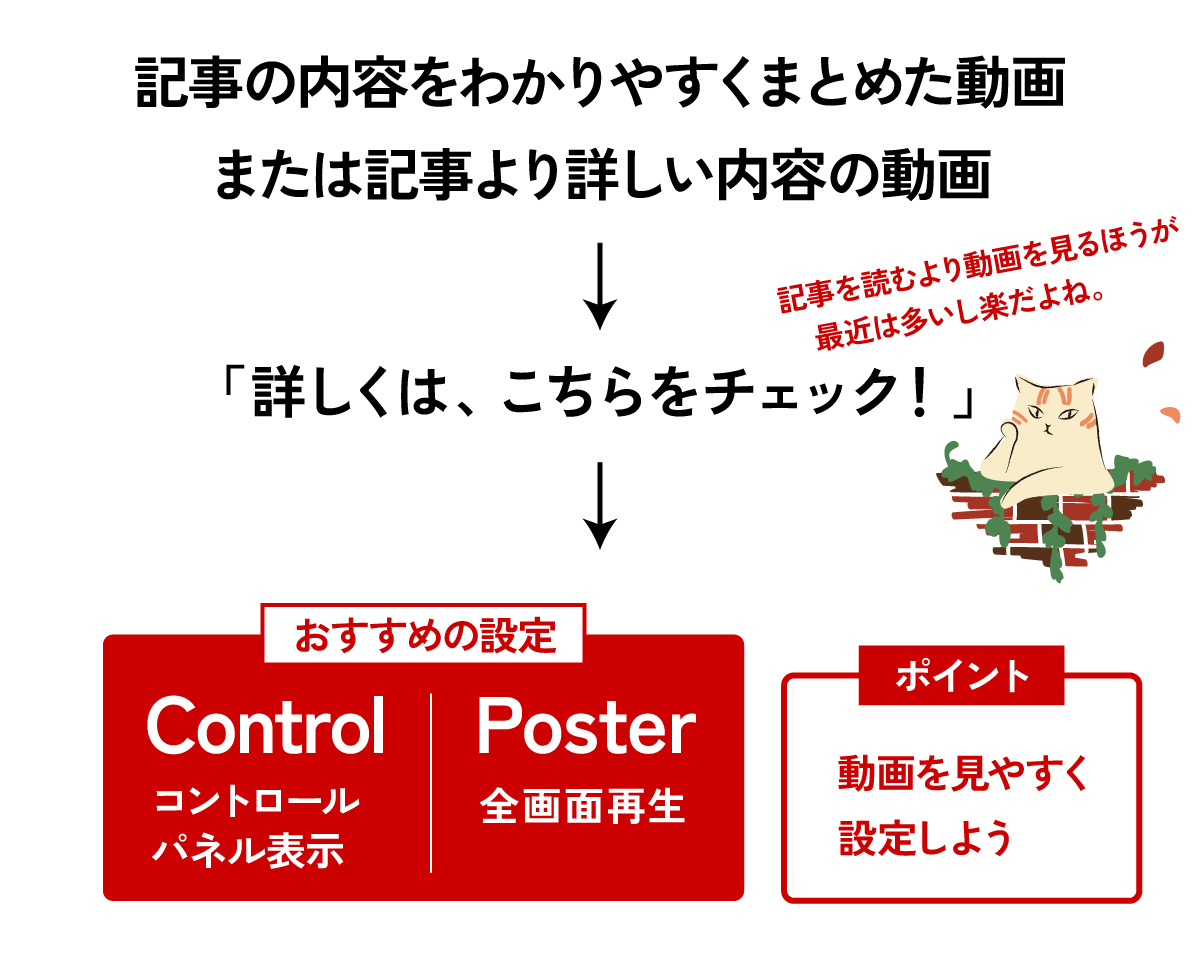 逆に、記事内容の詳細を動画にまとめた場合は、「詳しくはこちらの動画をチェック」みたいなコピーを入れてクリックさせるのが有効です。