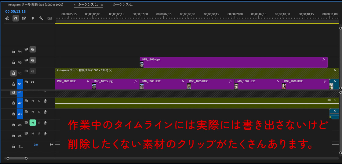 初心者の私は、不要なクリップを削除したあと、やっぱり必要になったりして素材から探し直すのが面倒になり、目隠ししたトラックに入れたまま。