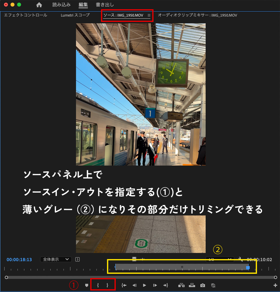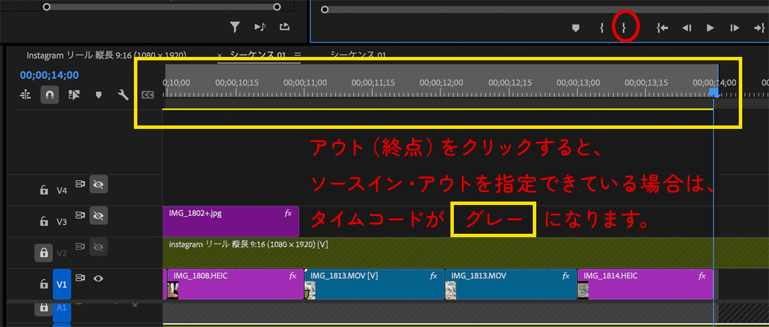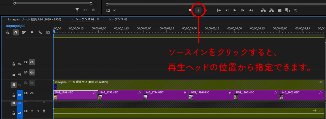 タイムライン上だけではなく、ソースパネルでソースイン・アウトを使うこともできます。