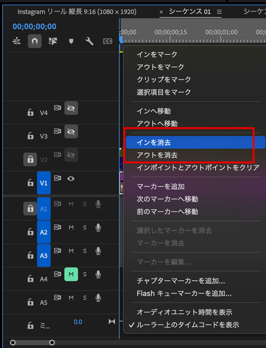 タイムコードの上で右クリックするとインを削除、アウトを削除が出るので、選択すれば消えます。