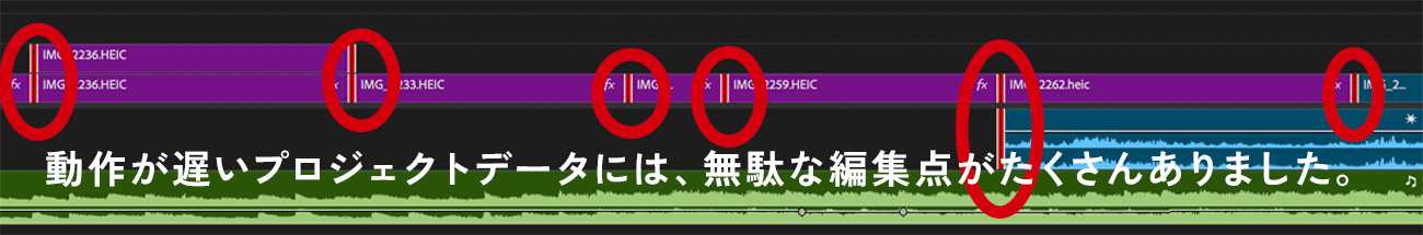 動画が遅い時に確認したら、このようにスルー編集点が複数ありました。