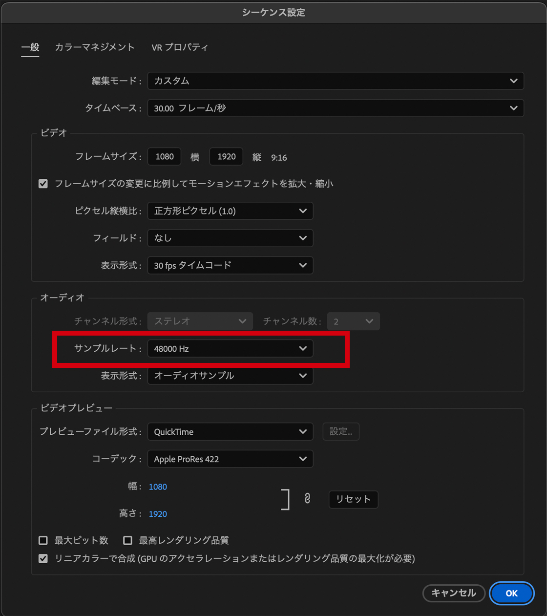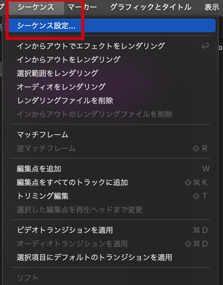 設定を調べるには、メニュー>シーケンス設定のパネルを開きます。