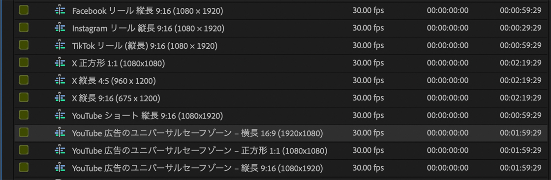 みたいなミスを防ぐために、PremiereProのデフォルトに追加されたSNSテンプレートを使いましょう。