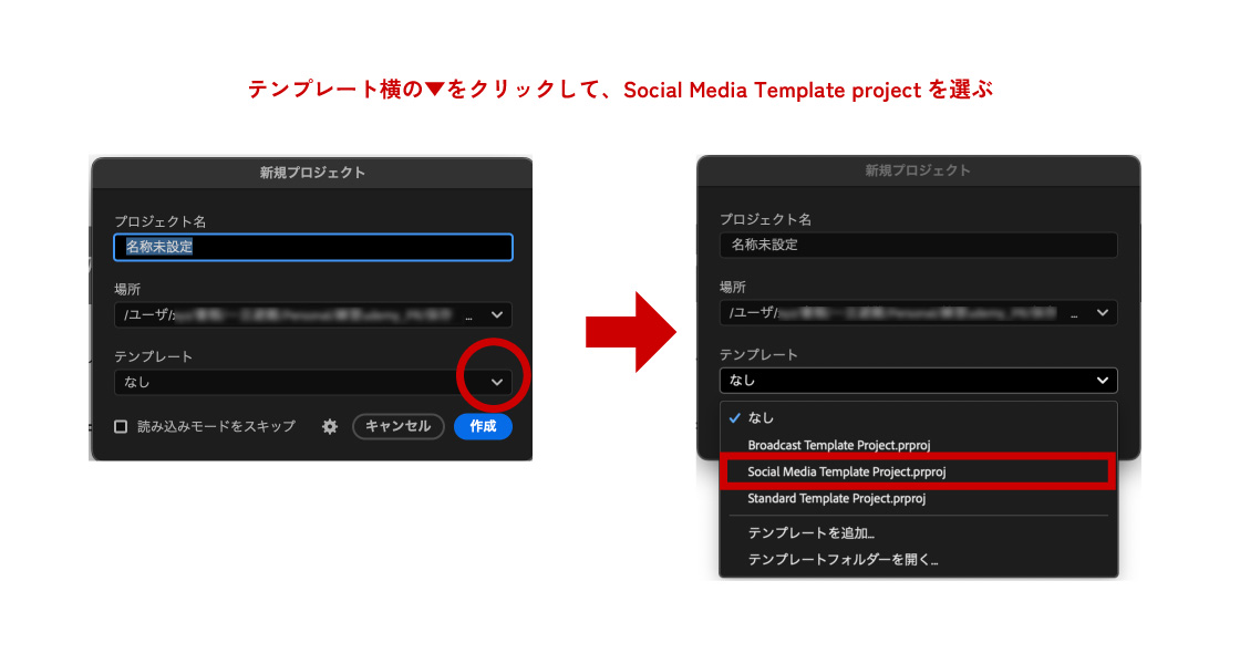 テンプレートの横の三角をクリックしてプルダウンして、Social Media Projectを選びます。