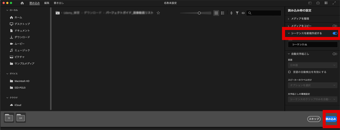 4. 次に読み込み画面になるので、編集したい素材を選びシーケンスを新規作成を有効にして読み込みボタンをクリックします。(通常通りの新規作成と同じ手順です)