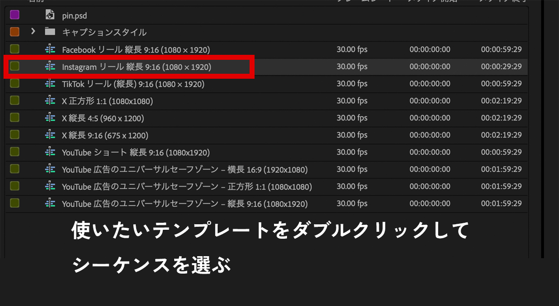 使いたいシーケンス(今回はInstagramリール)を選びダブルクリックします。