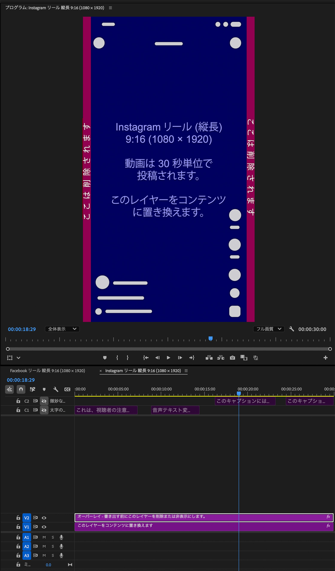 6. プログラムモニターにInstagramのテンプレートが表示されます。