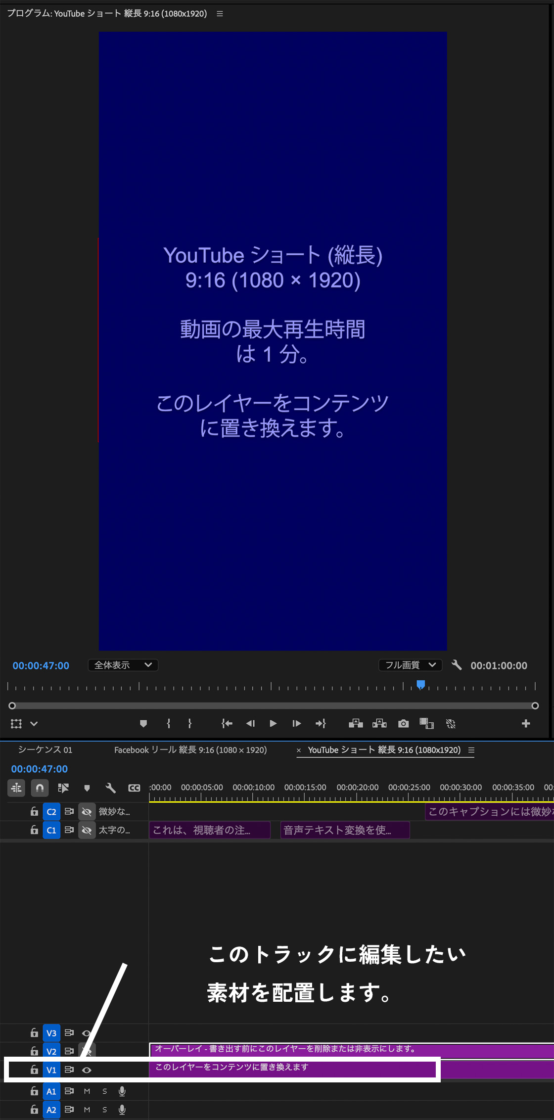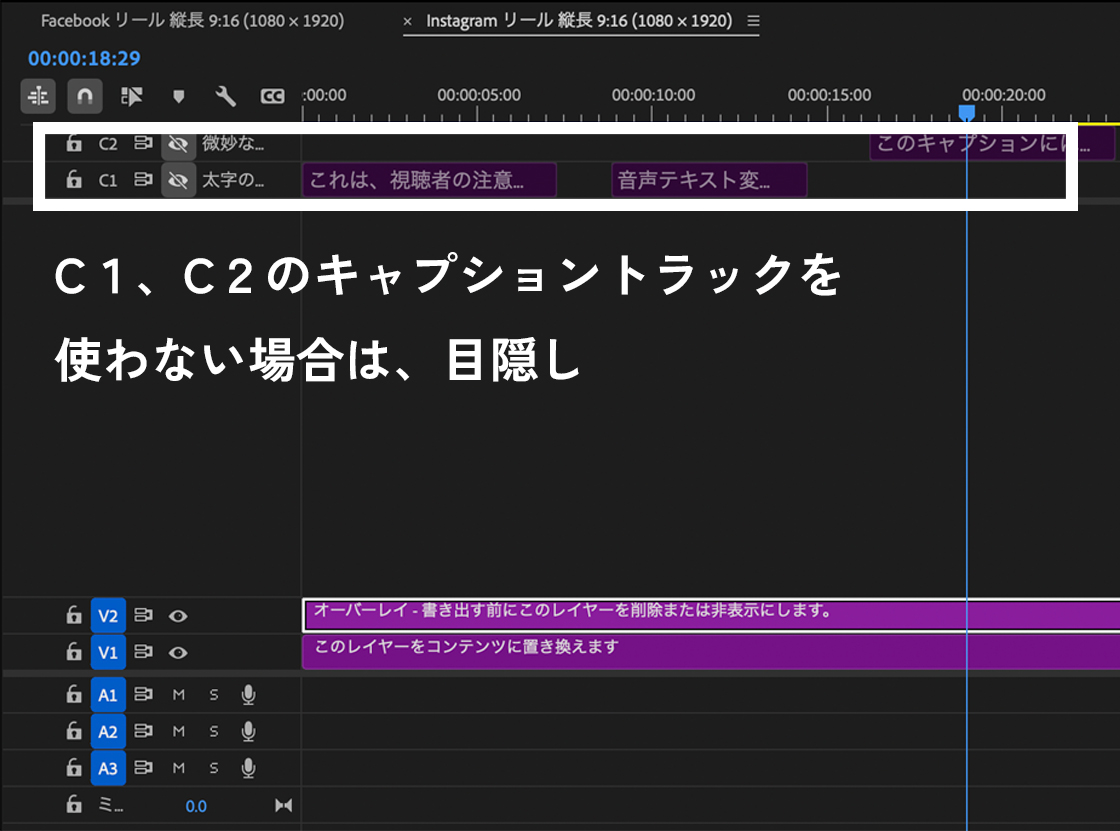 C1/C2の字幕トラック(キャプション)と、V1/V2のビデオトラックに、それぞれガイドが配置されています。