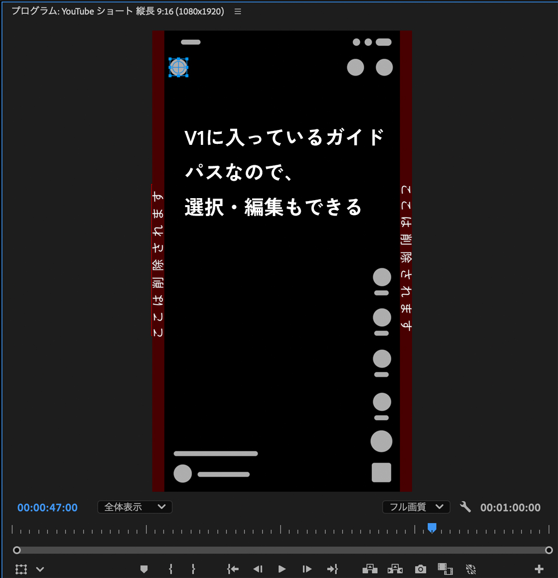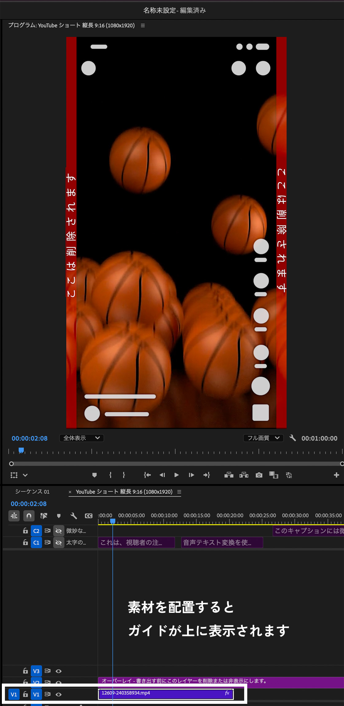 素材動画の上(V1トラック)に、ガイドが表示されています。